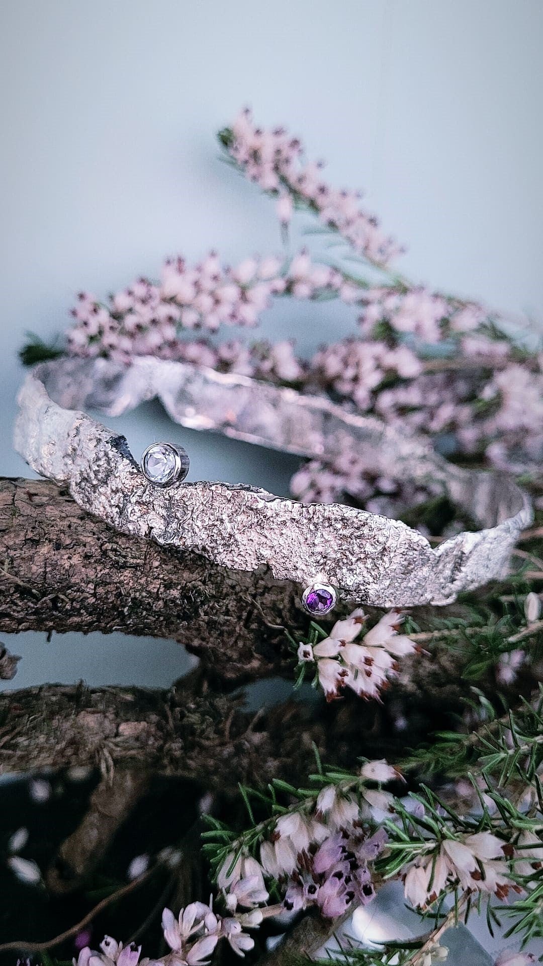 A beautiful enchanting Faerie Tale Bangle in sterling silver, with stunning texture, set with 4mm Blue Topaz & Amethyst Gems. This bangle is beautifully organic in shape & texture, and measures Approx 1 cm width.