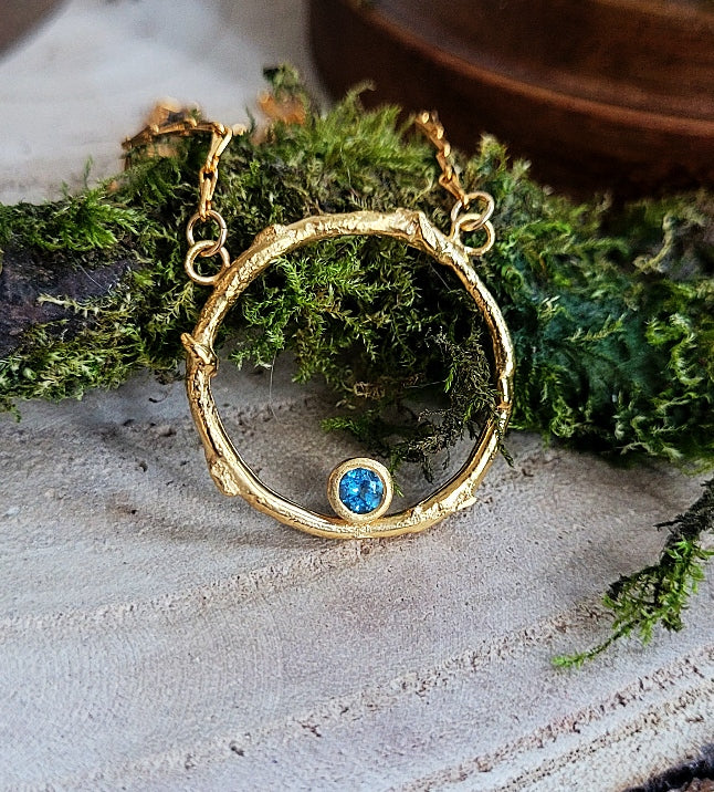 A beautiful rustic Faerie Ring Pendant plated in 18ct Yellow Gold, set with a 4mm Blue Topaz, on a 16 inch gold plated Barley Corn Chain.  This is a made to order piece - please allow 4 weeks for delivery