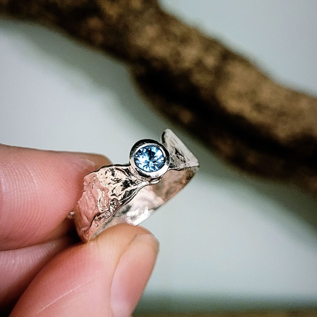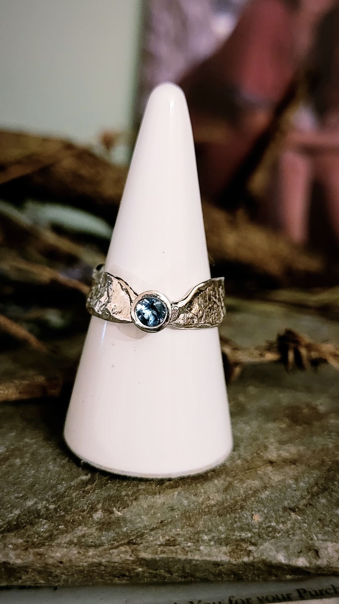 An alternative sterling silver Faerie Tale Band, with beautiful organic texture, set with a stunning 4mm Blue Topaz.