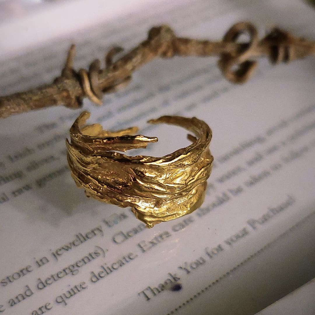 The Bark Ring is a representation of a beautiful natural piece of bark, which wraps elegantly around the finger, in 18ct Yellow Gold Plated or 9ct solid yellow Gold.
