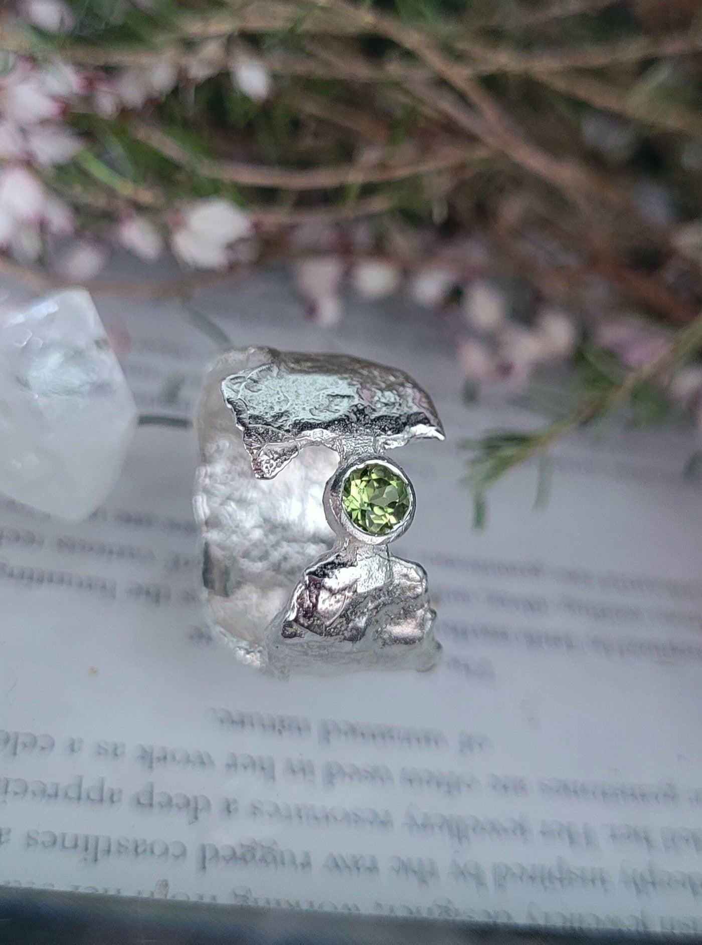 A sterling silver Faerie Tale Ring, set with a beautiful 4mm faceted round Peridot. One available in size N