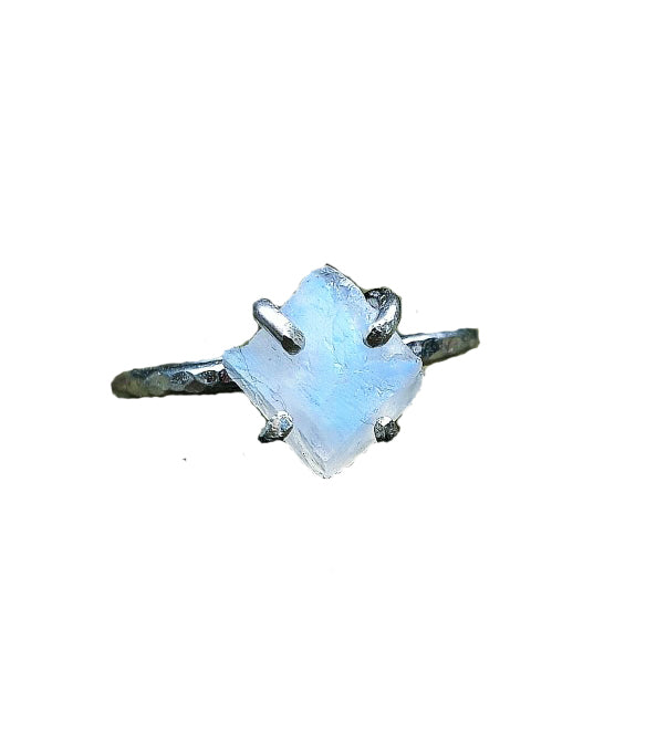 A beautiful Raw Moonstone Gemstone set in sterling silver claws, on a hammer textured sterling silver band.